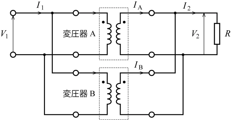 変圧器の並行運転では、1次側と2次側の電圧を揃える必要があります。電流は変圧器の性能に応じて分担され、必ずしも等しくありません。