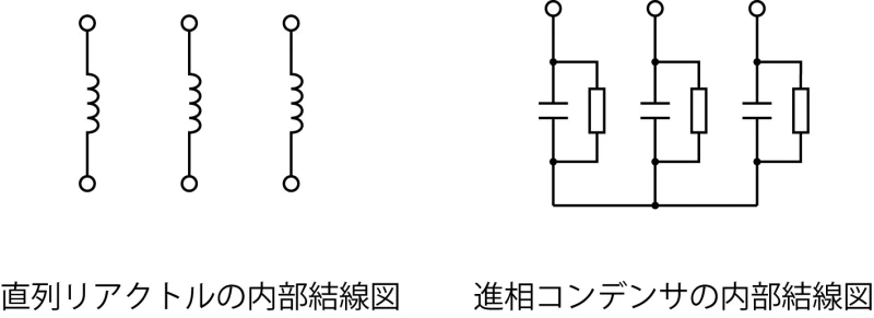 一般に、直列リアクトルは負荷と並列に接続された進相コンデンサと三相交流電源の間に接続されるので、端子数は6です。一方、進相コンデンサは電源側の端子だけを持ち、端子数は3です。